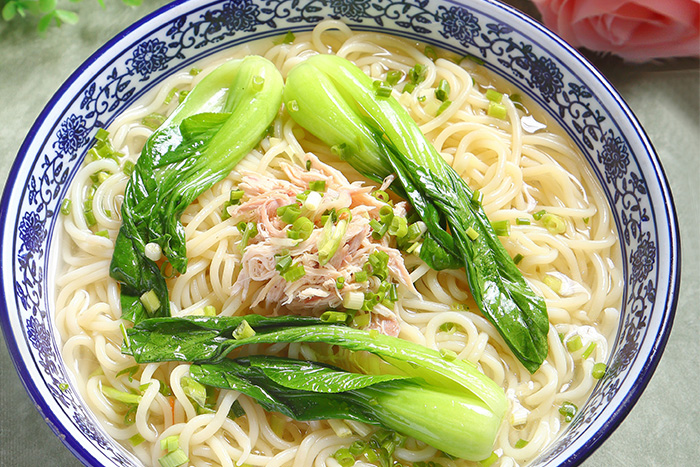 2.鍋中燒開水下180克面煮熟,下青菜煮熟撈出裝碗(擺菜注意美觀);